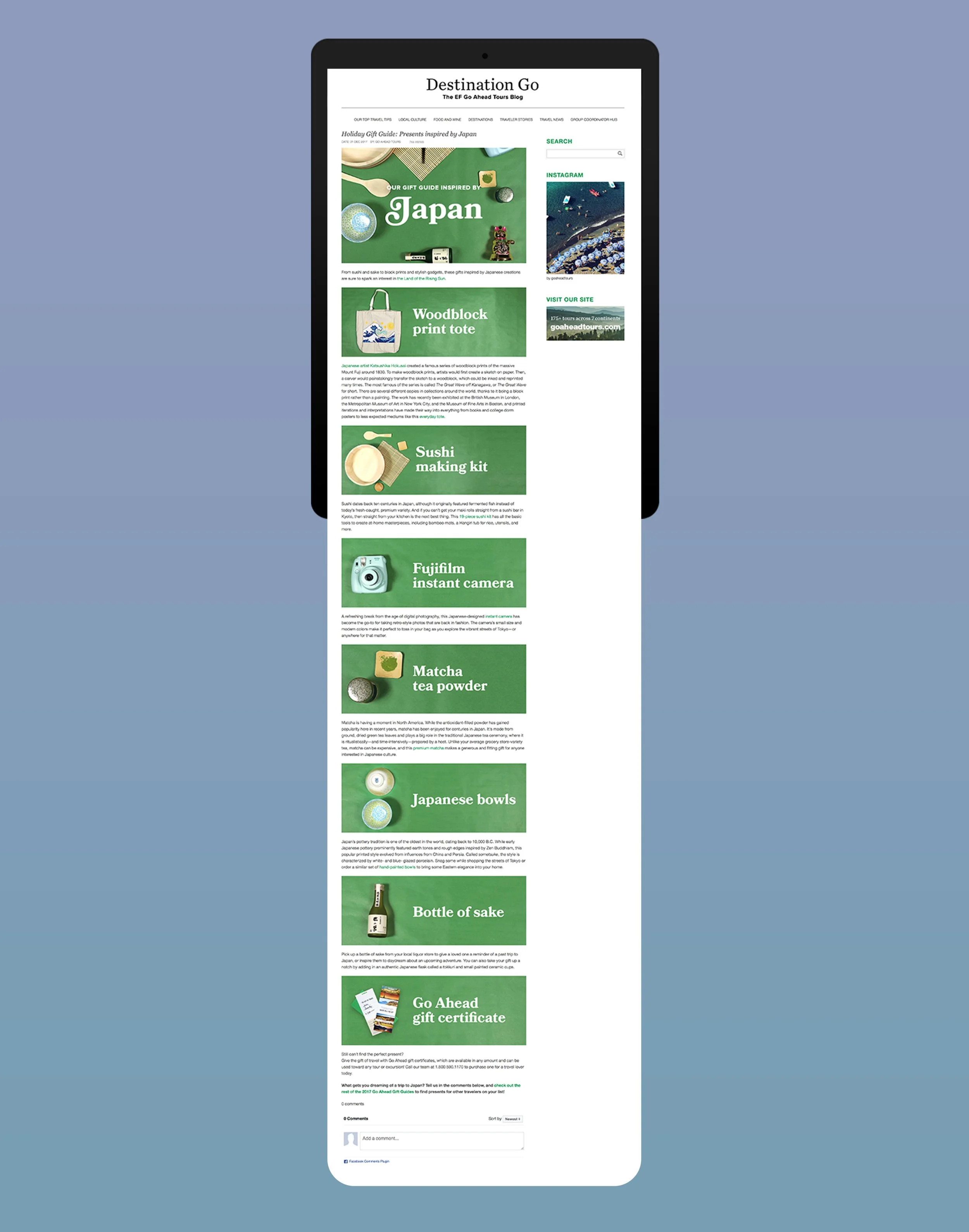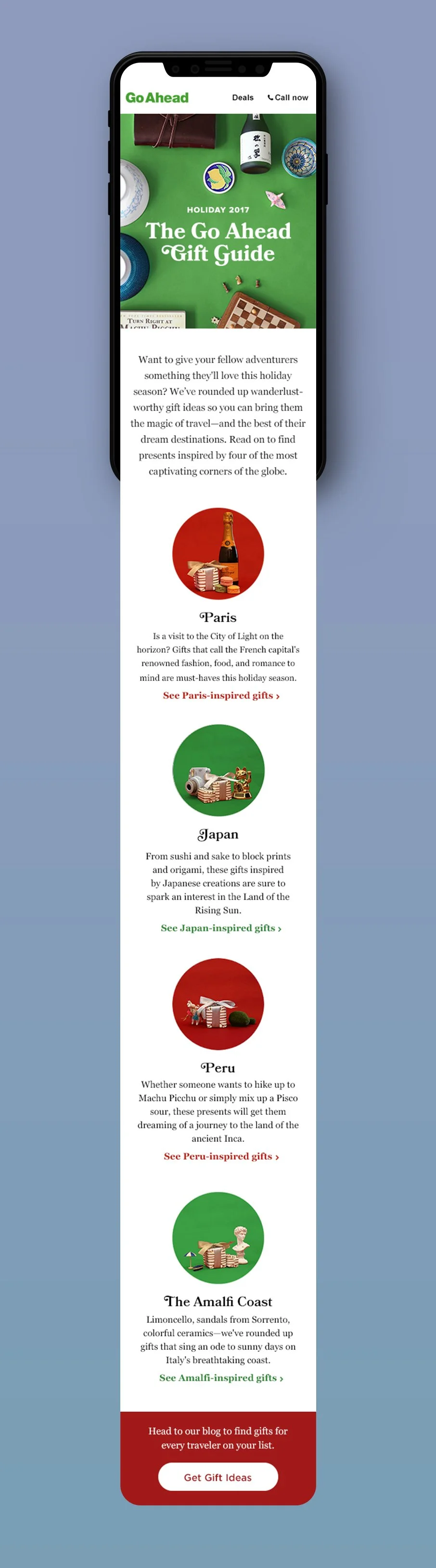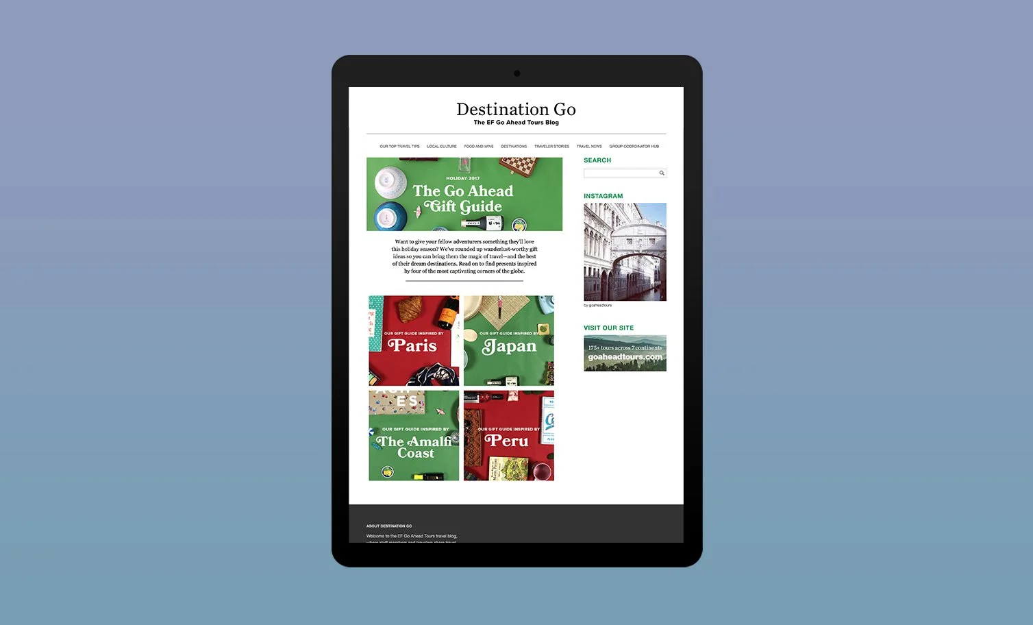 In the spirit of the holiday season, we created a Go Ahead Gift Guide around some specific destinations. After crowd-sourcing some gift ideas from Paris, The Amalfi Coast, Peru, and Japan, we photographed the gifts and built a campaign on our blog and social channels.